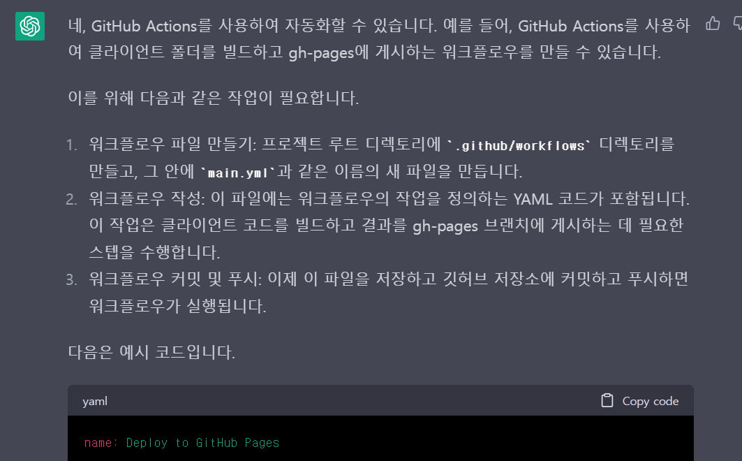 이 과정을 GitHub Actions를 사용하여 자동화했다. 처음엔 어떻게 작성해야 하는지 관하여 모르니까 ChatGPT에 물어봤더니 친절하게 답해주었다. ChatGPT 제공한 코드을 보면서 secrets으로 환경 변수를 사용하는 등 추가적인 설정을 넣어주니 github-pages에 배포가 잘 되었다.