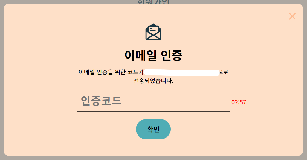 회원가입 로직에서 이메일과 비밀번호를 입력하고 버튼을 누르면 이메일 인증 모달이 뜨게 된다. 이메일 인증 3분 제한 시간이 있어 사용자가 알아볼수 있도록 타이머를 구현해야했다. 3:00으로 시작하여 1초 씩 줄어들고 0:00이 되면 인증 메일 재전송 버튼으로 변경된다.