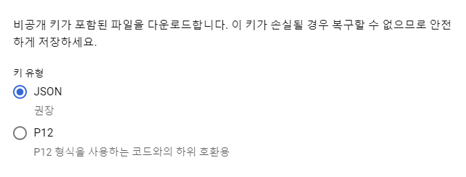 생성된 서비스 계정에서 키 관리에 들어가 새 키 만들기를 통해 JSON으로 확인을 누르면 JSON 파일이 다운로드 받아진다.
