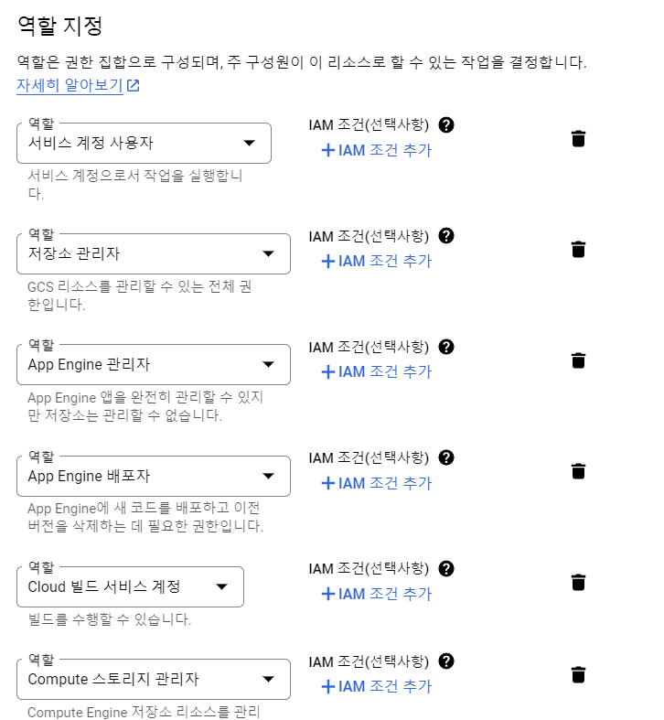 이때 서비스 계정 키에 대한 JSON을 발급 받으려면 일단 GCP에서 서비스 계정을 생성해야 한다. 생성 과정에서 배포에 필요한 역할을 지정해야 한다. 접근 권한 때문에 몇 번의 에러를 만난 끝에 아래와 같이 권한을 부여했더니 정상적으로 잘 작동하였다. (이 과정에 필요 없는 역할이 있을 수도 있다..)