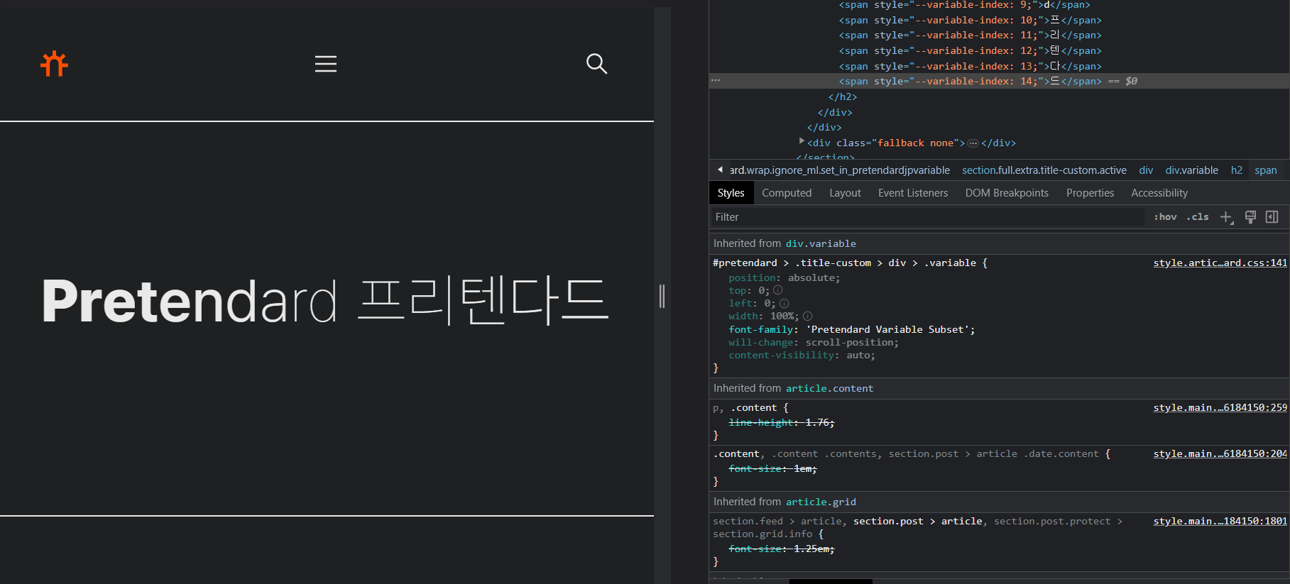 프리텐다드 폰트 디자이너님 블로그의 프리텐다드 주제의 글에 들어가면 보이는 애니메이션도 가변폰트를 사용한 걸 볼 수 있다. 가변폰트를 통하여 폰트 애니메이션 효과를 효율적으로 적용할 수 있을 것 같다.