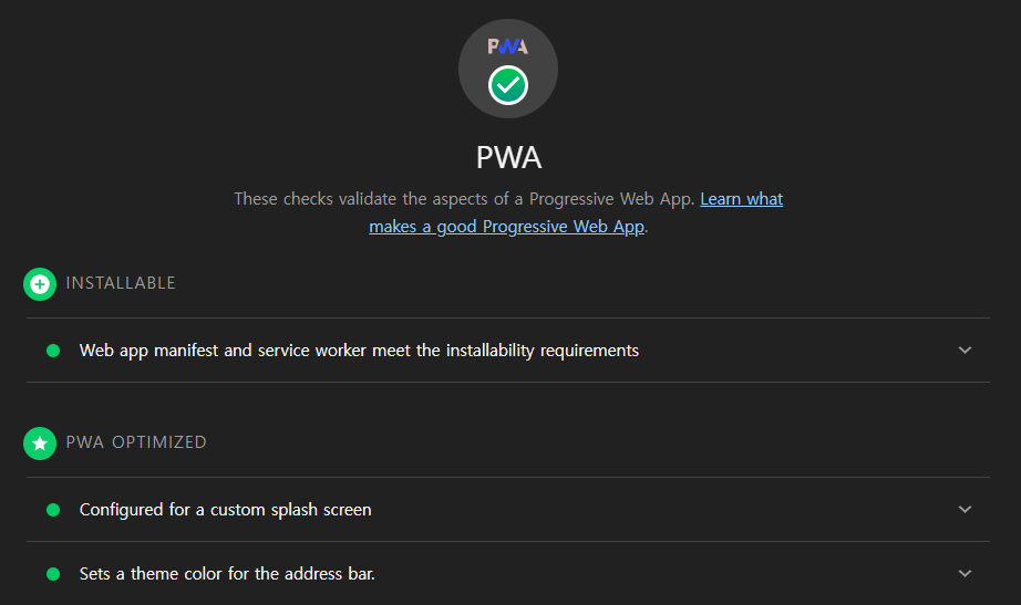 또한 Lighthouse 사용하여 PWA 검사를 할 수 있다.