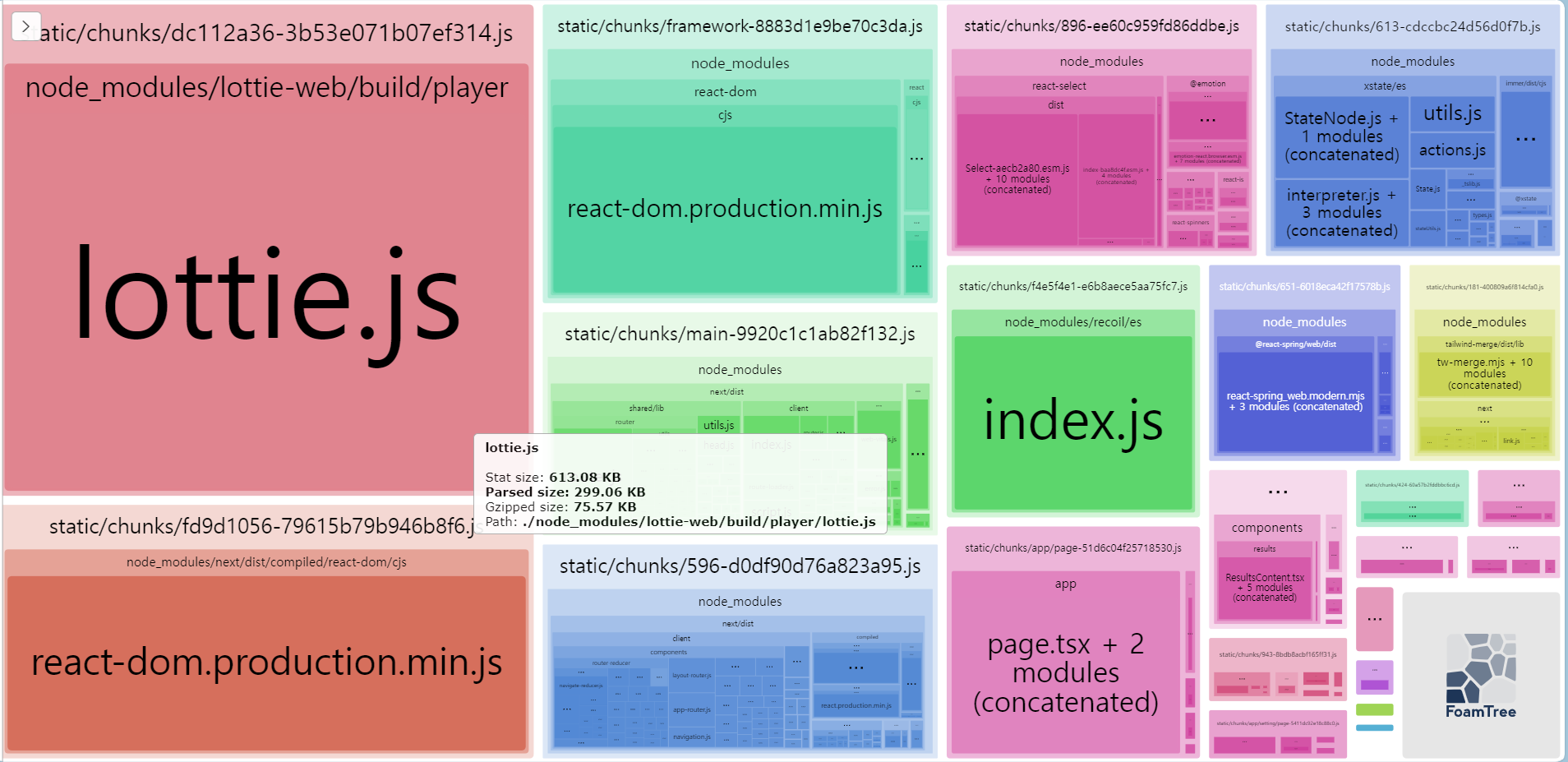 @next/bundle-analyzer를 통하여 번들 크기를 분석하였을 때 lottie 파일이 프로젝트에서 가장 크게 차지하는 모습을 볼 수 있었다. 이를 최적화할 방안을 찾아보니 기존의 lottie-react 라이브러리를 사용하였는데 번들 크기를 감소시킬 수 있는 lottie-light-react 라이브러리가 있어서 기존 라이브러리 대신 적용하였다.