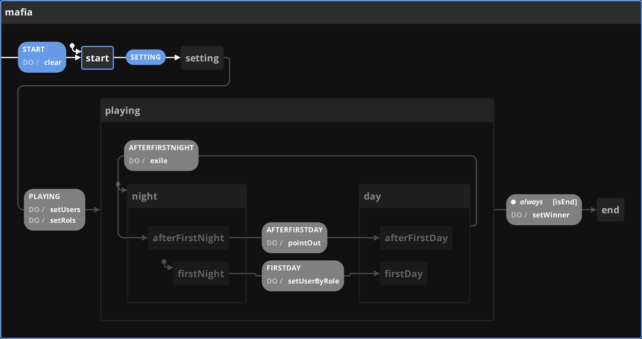 마피아 머신 statechart이다. 크게 start -> setting -> playing -> end의 구조로 이루어져 있다.